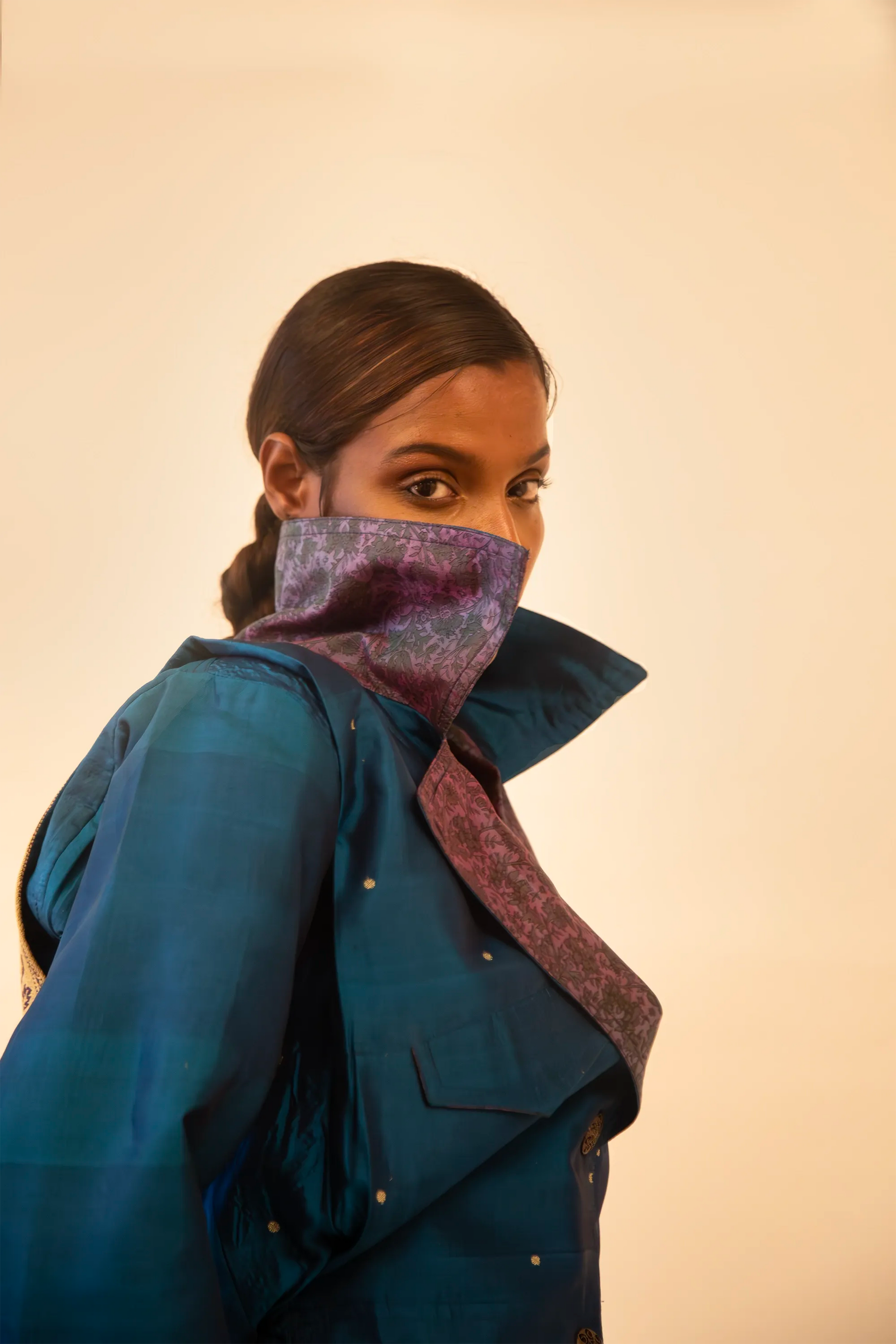 AMBR is our one-of-a-kind cropped two-toned silk brocade bomber jacket, handcrafted by skilled artisans in-house using a vintage silk saris. The back panel features a rich brocade. In our effort to use what already exists, both layers are crafted entirely from vintage textiles. With an exaggerated collar, a slight cinch at the waist, and antique buttons, Ambr stands as a tribute to local craftsmanship and mindful creation.